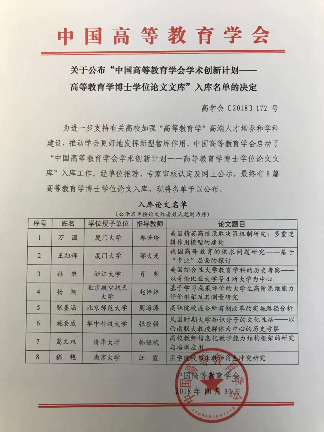 · 杨翊助理研究员的《基于学习成果评价的大学生高阶思维能力评价框架及其测量研究》入选“中国高等教育学会学术创新计划——高等教育学博士学位论文文库”