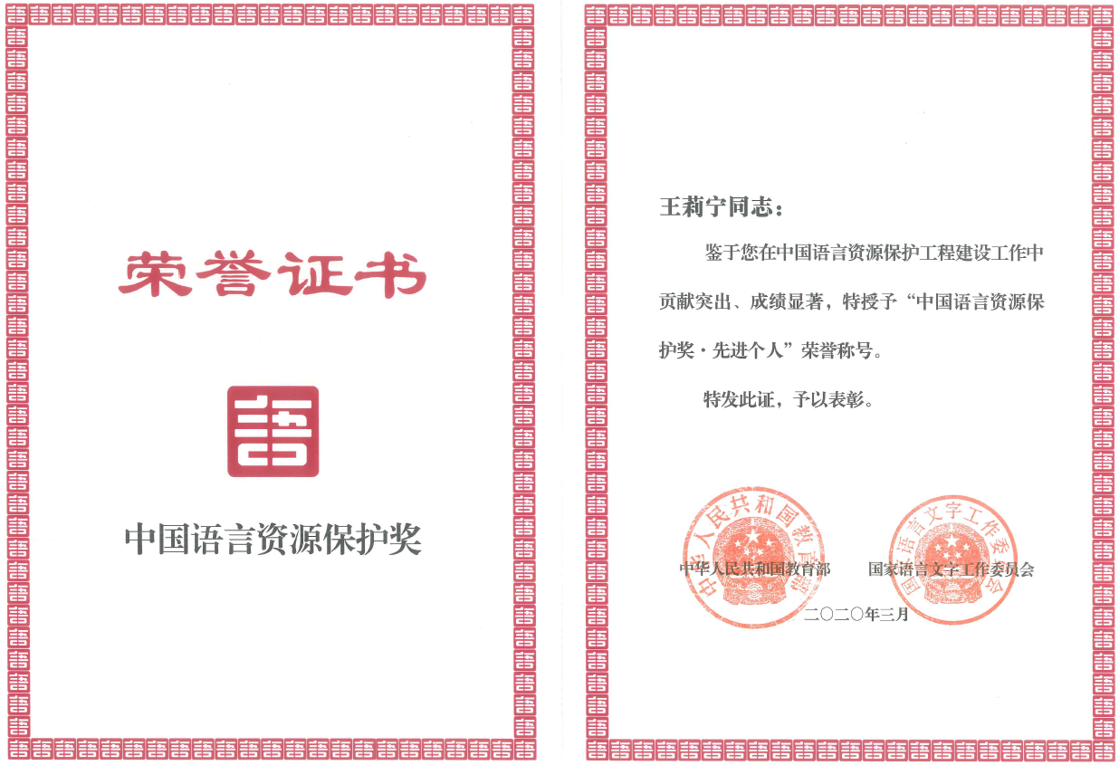 · 王莉宁研究员荣获“中国语言资源保护奖 · 先进个人”称号