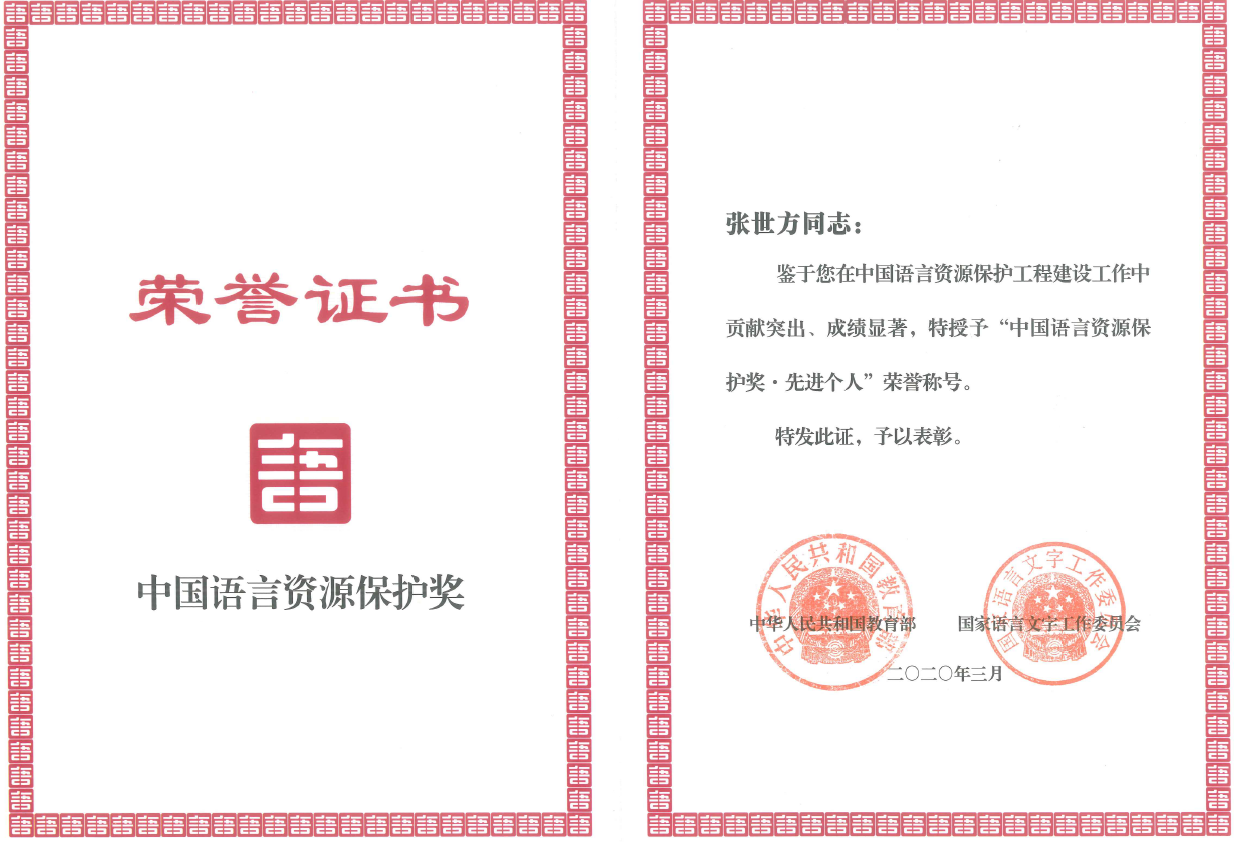 · 张世方研究员荣获“中国语言资源保护奖 · 先进个人”称号