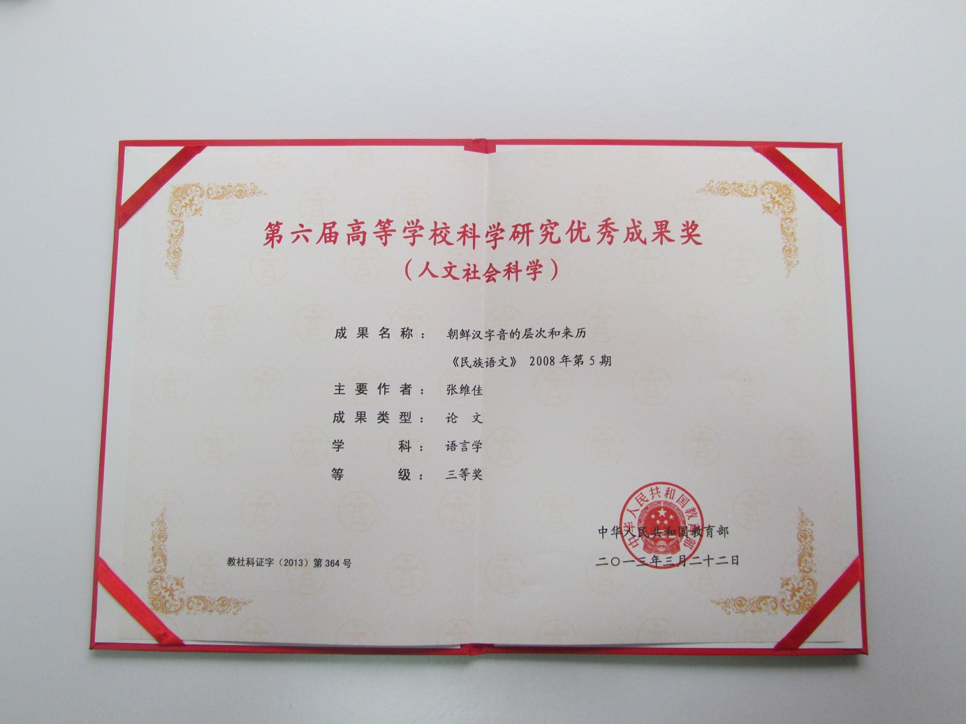 · 张维佳教授的《朝鲜汉字音的层次和来历》获教育部第六届高等学校科学研究优秀成果奖(人文社会科学)三等奖