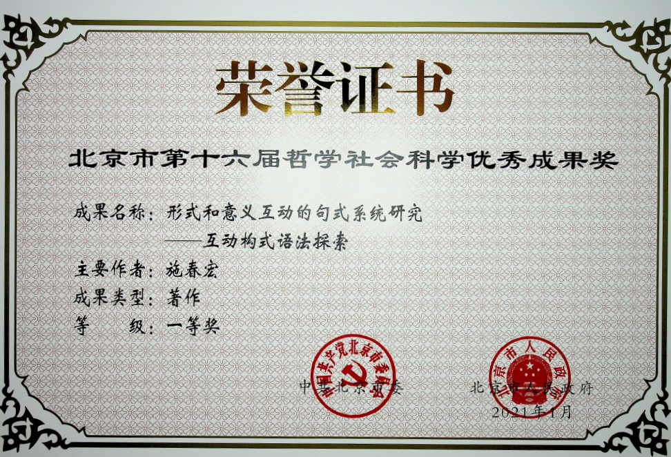 · 施春宏教授的《形式和意义互动的句式系统研究——互动构式语法探索》获北京市第十六届哲学社会科学优秀成果奖一等奖